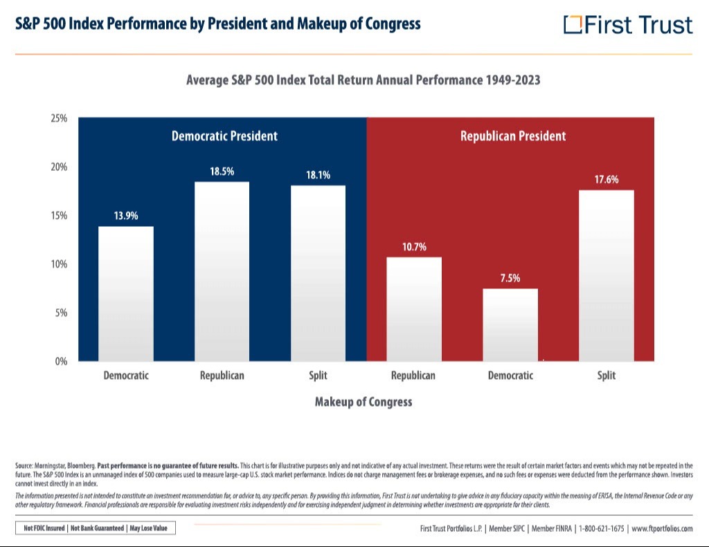 Most experts predict that the upcoming elections will result in a split Congress. This means that regardless of who wins the presidency, significant policy changes may be difficult to enact without bipartisan support. Historically, markets have performed well under a split Congress, as it often results in a balance of power that can lead to more moderate and stable policy decisions. The graphic below illustrates historical market performance under different combinations of presidential and congressional control.